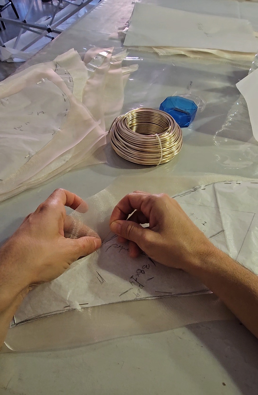 El diseño de los patrones fueron hechos a mano, exclusivos y únicos. De manera delicada cada uno de los pétalos fueron realizados con calor, pintados a mano con la técnica de hiperrealismo y dándole un toque lineal para enfatizar la sensación de movimiento.