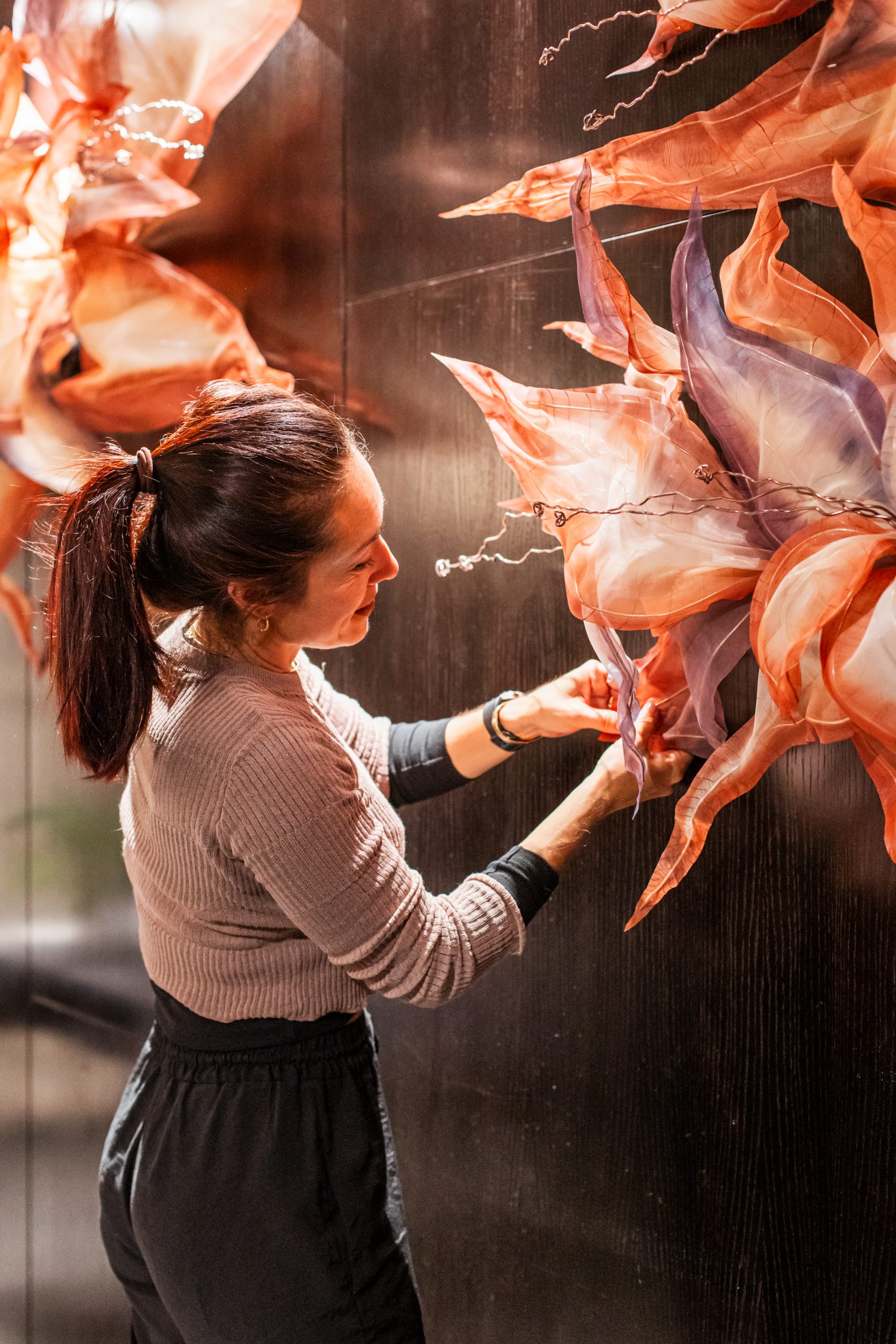 “Vol de Feuilles” es una escultura decorativa artesanal inspirada en la delicadeza de la naturaleza. Cada pétalo ha sido diseñado y pintado a mano mediante técnicas de hiperrealismo, creando una pieza única que transmite movimiento, ligereza y serenidad.