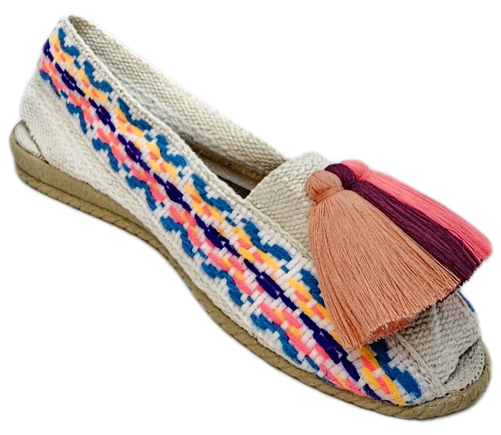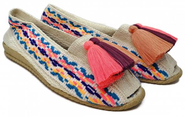 Sé el primero en valorar “Alpargata color blanco arcoiris con borlas vino rosa”
