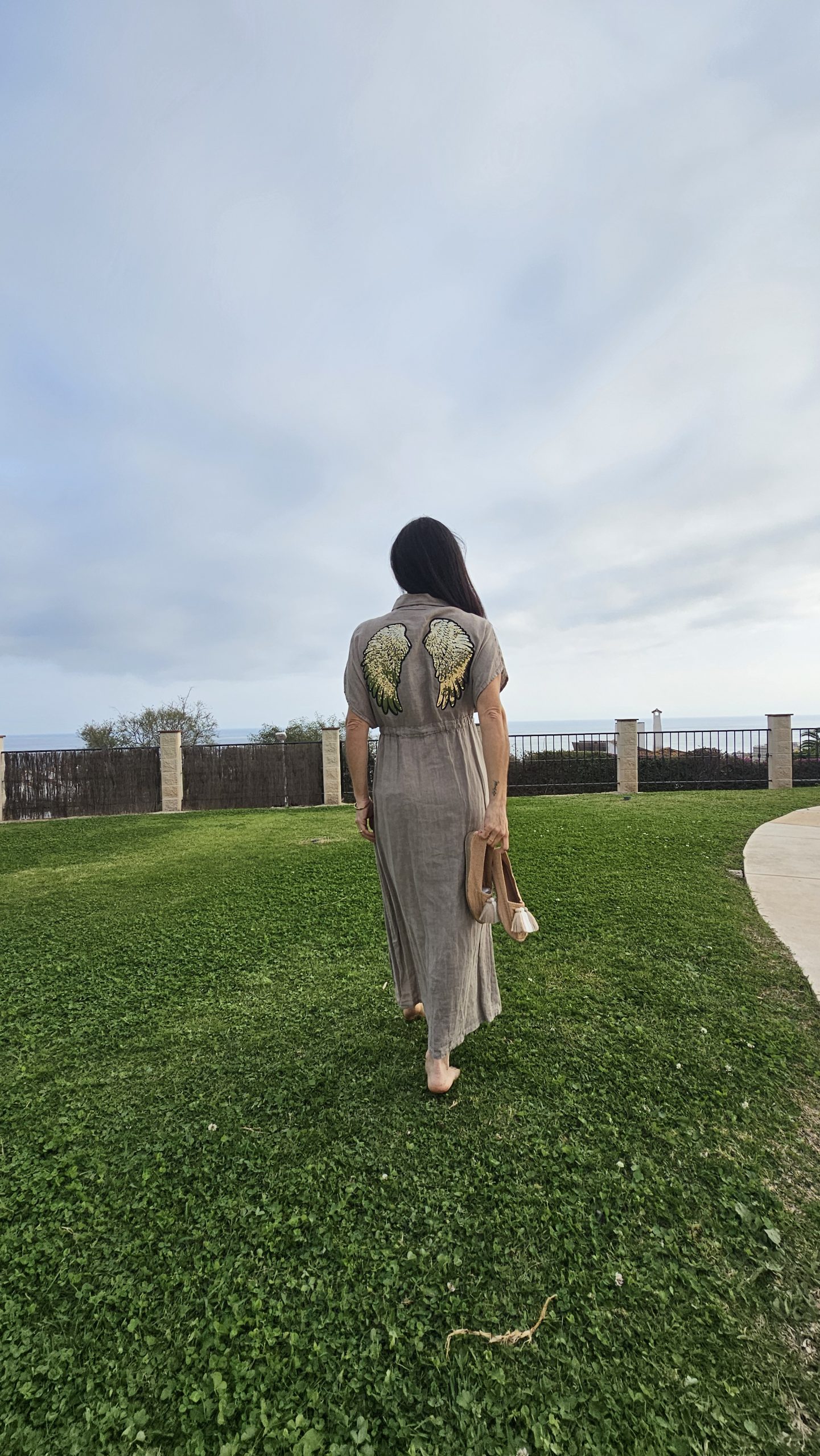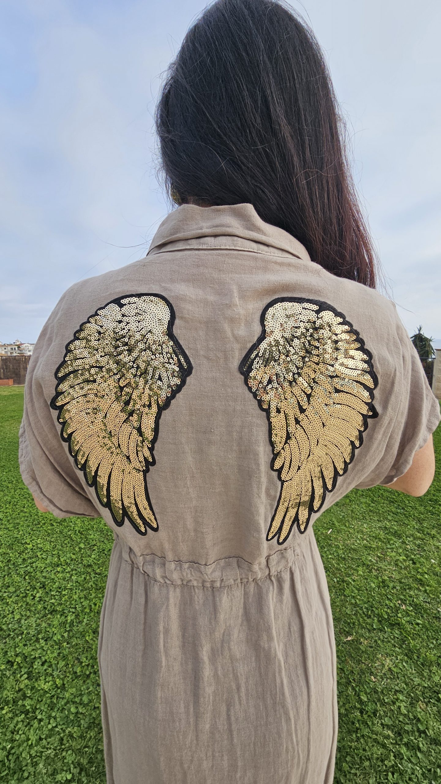 Sé el primero en valorar “Vestido de Lino ajustable camel logo alas doradas pequeñas”