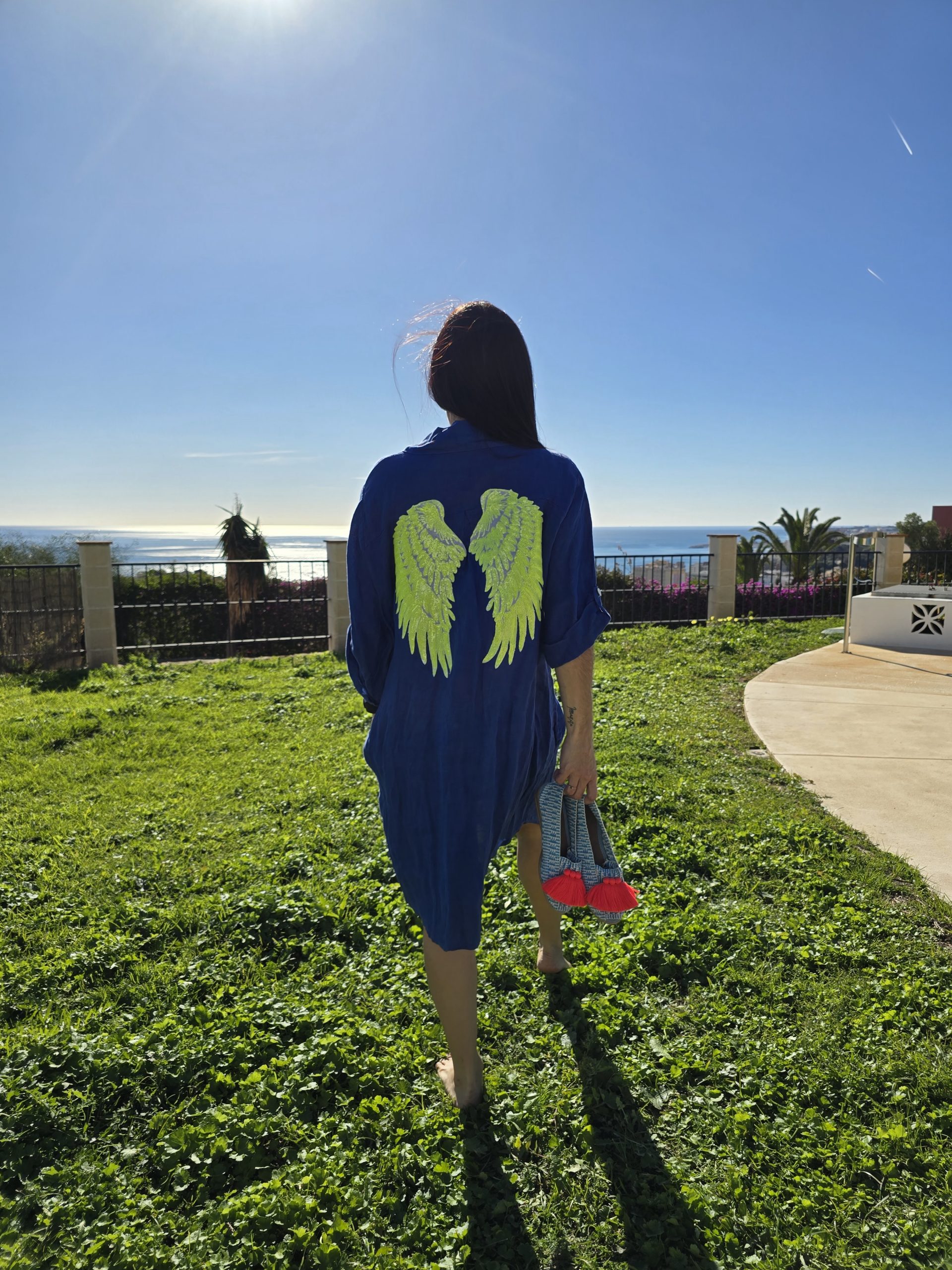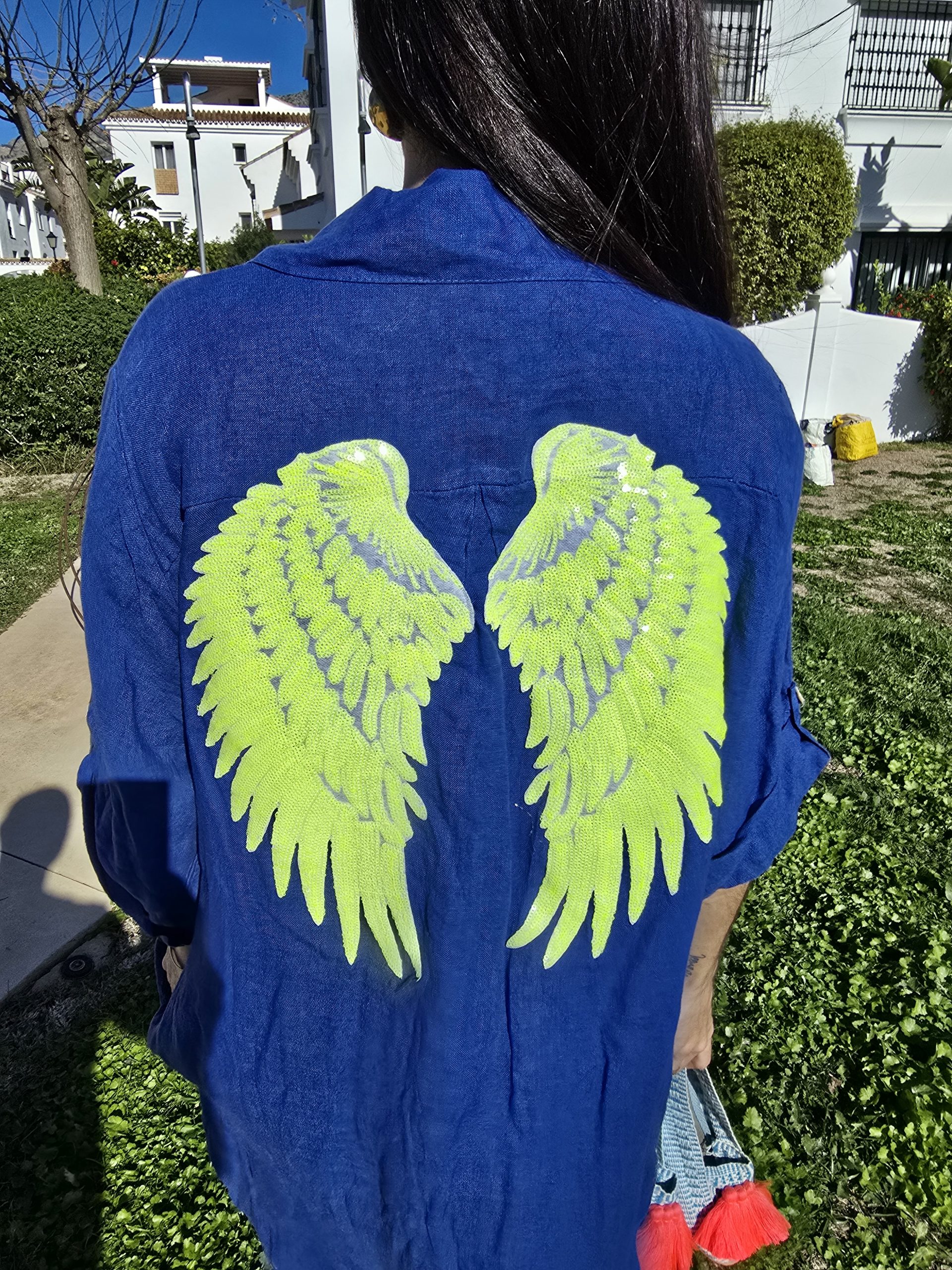 Sé el primero en valorar “Vestido de lino azul con logo alas amarillo neón”