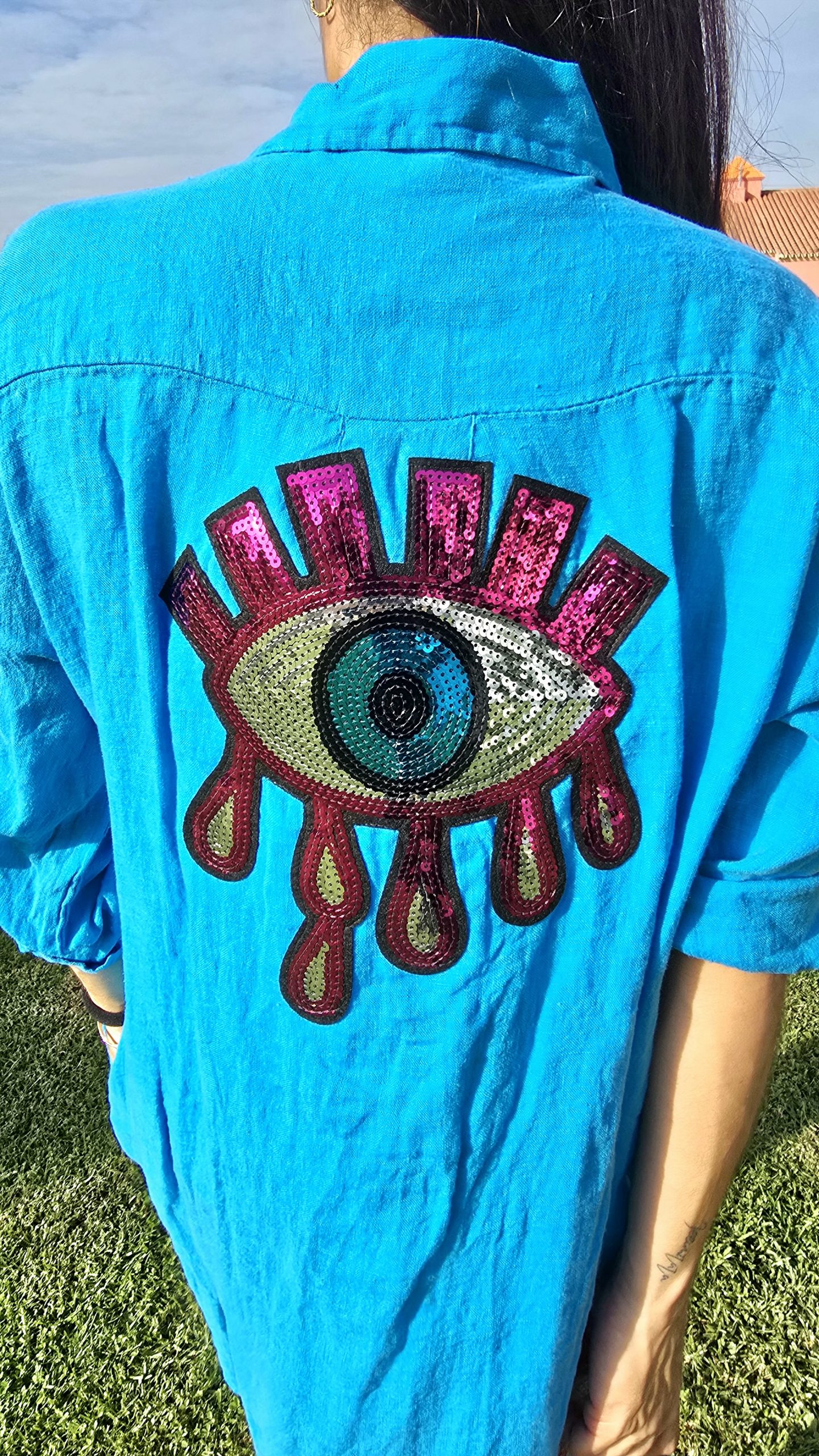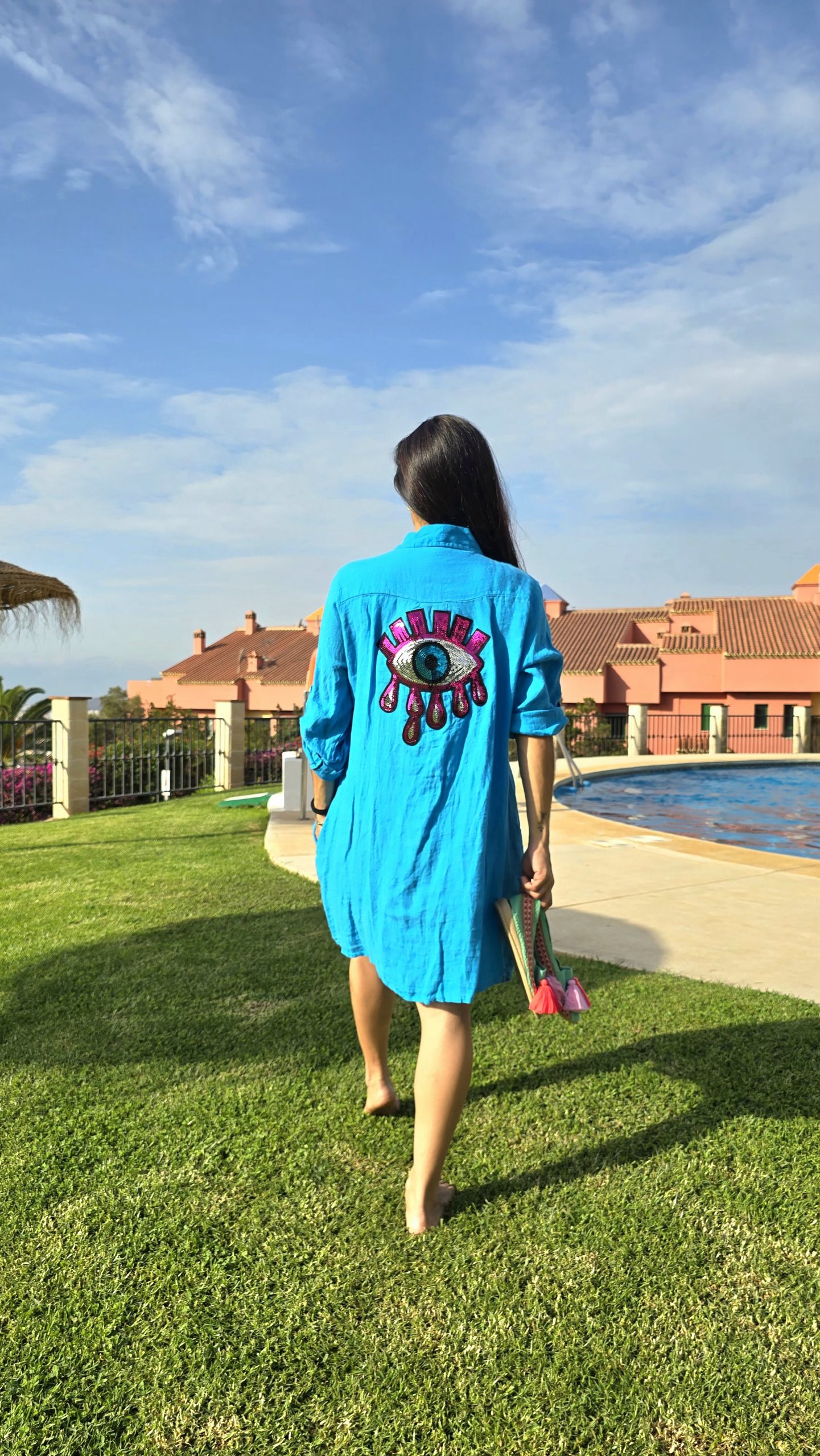 Sé el primero en valorar “Vestido de Lino Azul cielo corto logo ojo turco fucsia”