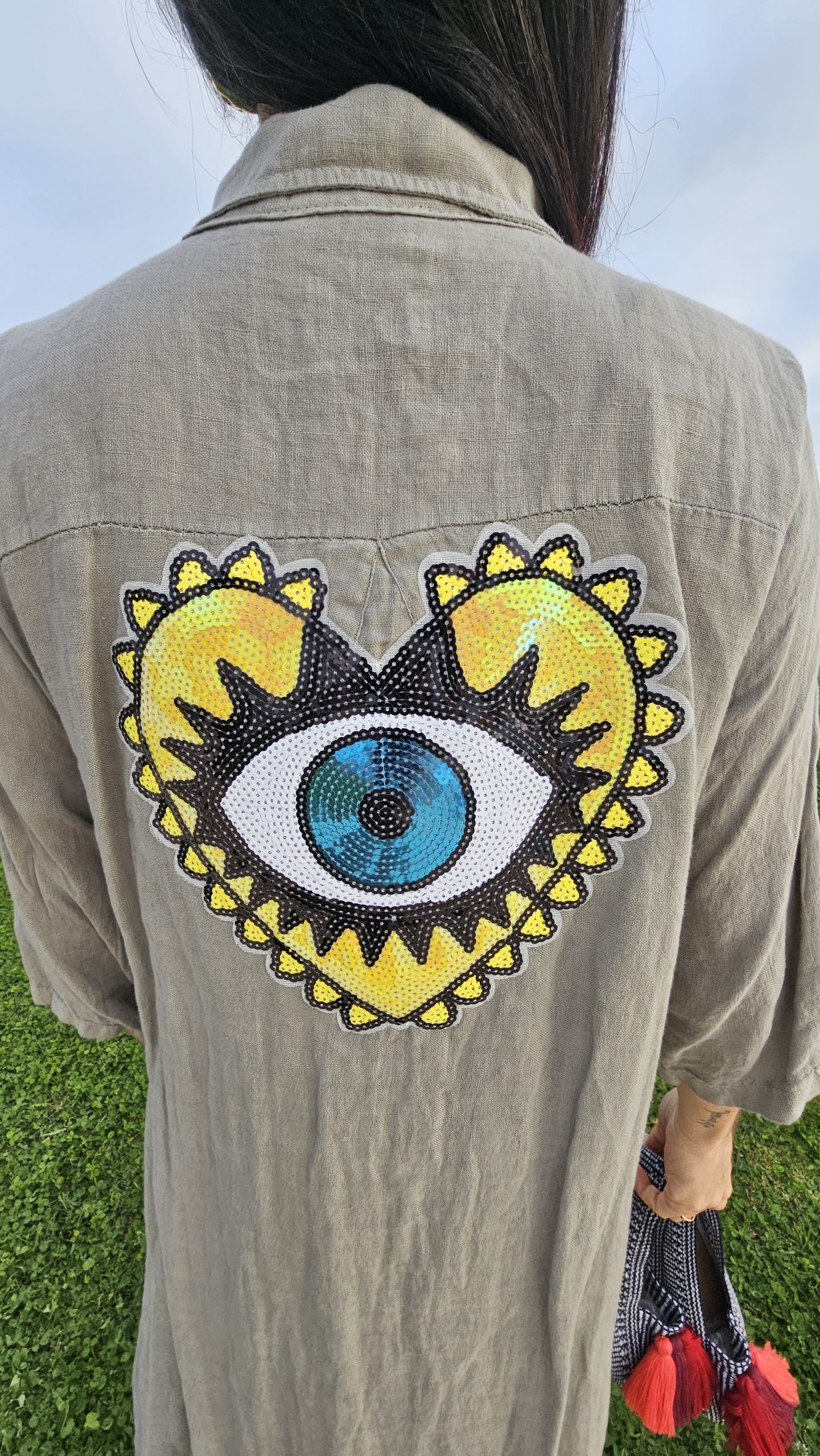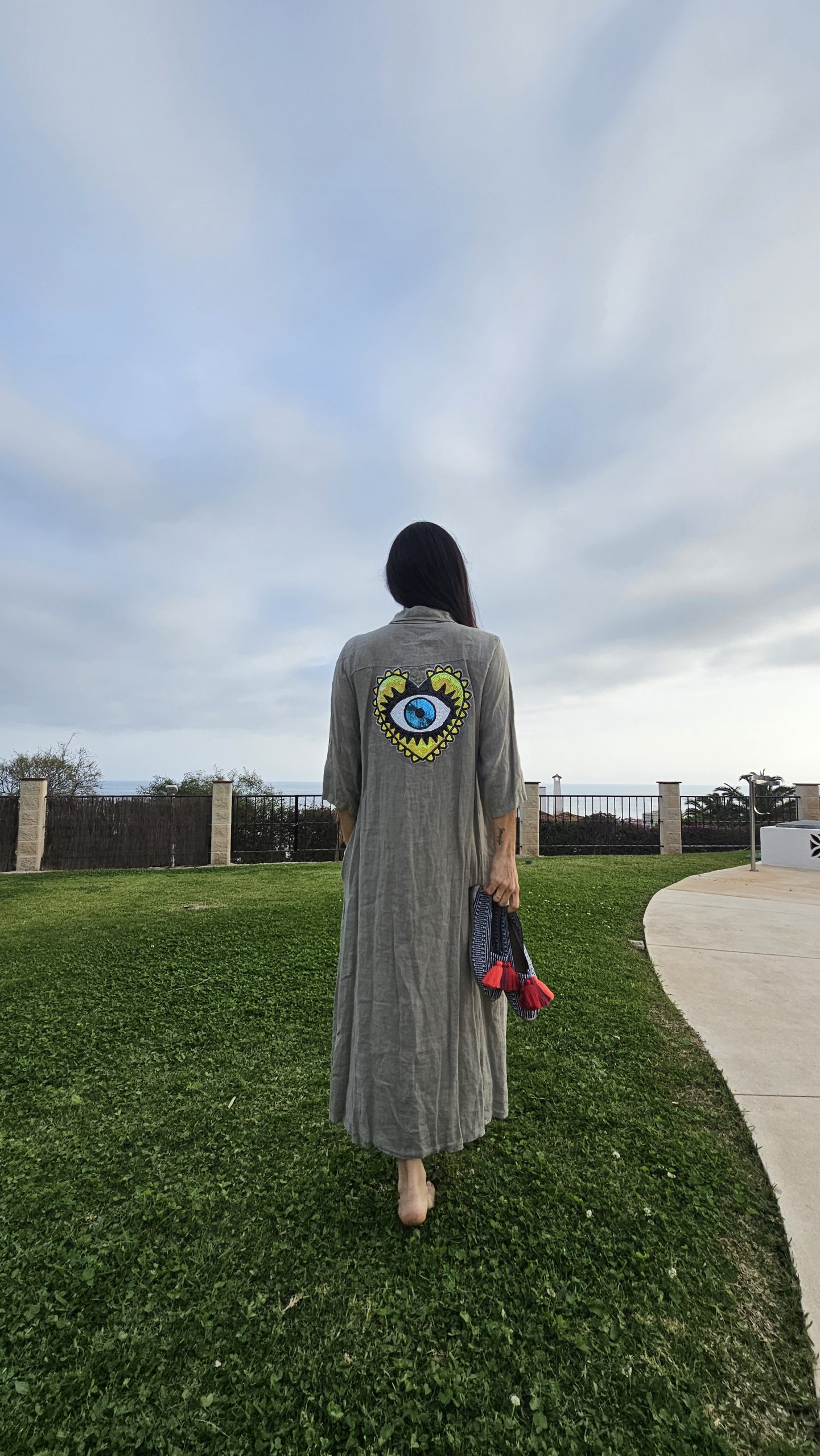 Sé el primero en valorar “Vestido de Lino gris plomo con logo ojo turco amarillo corazón”