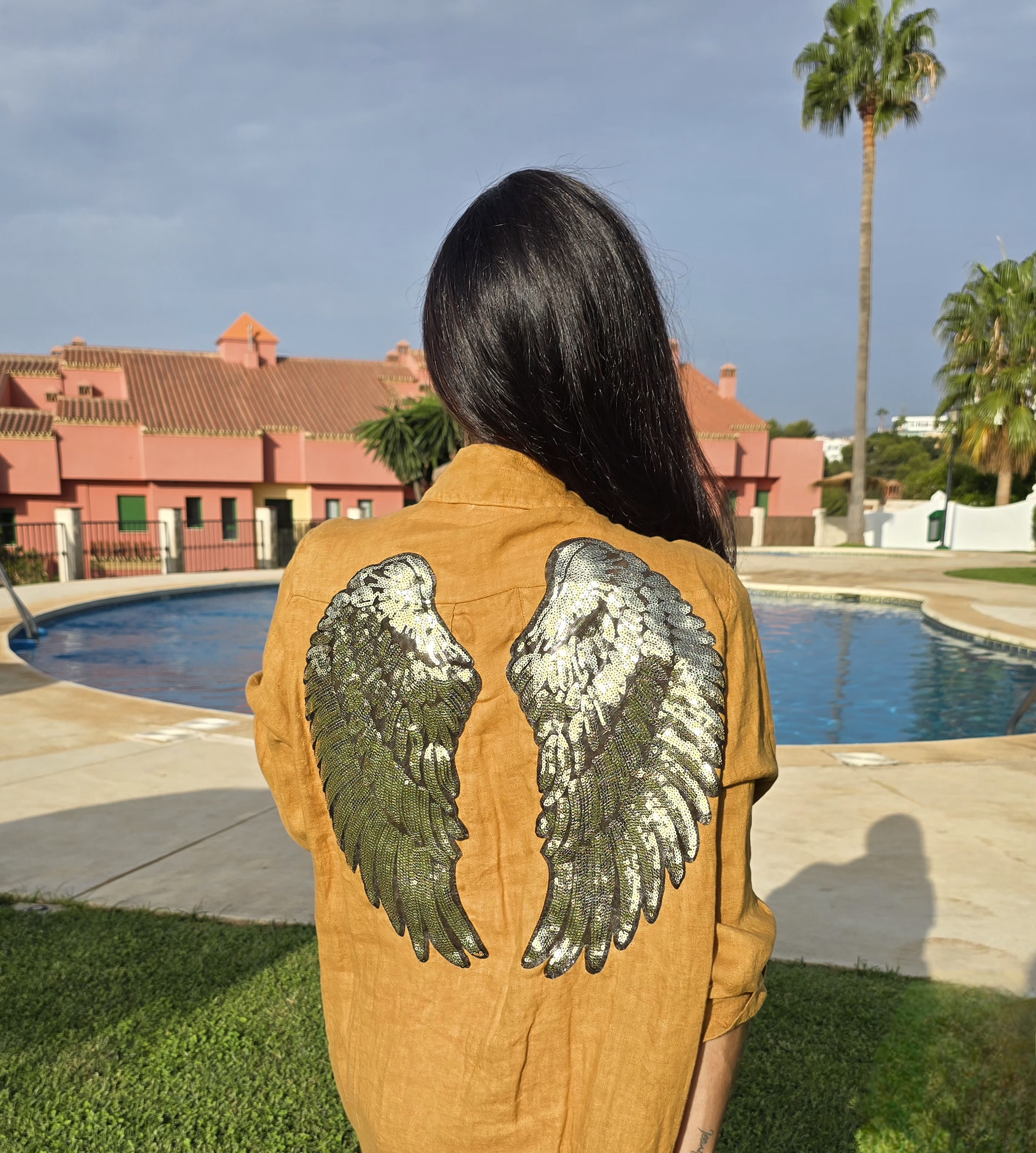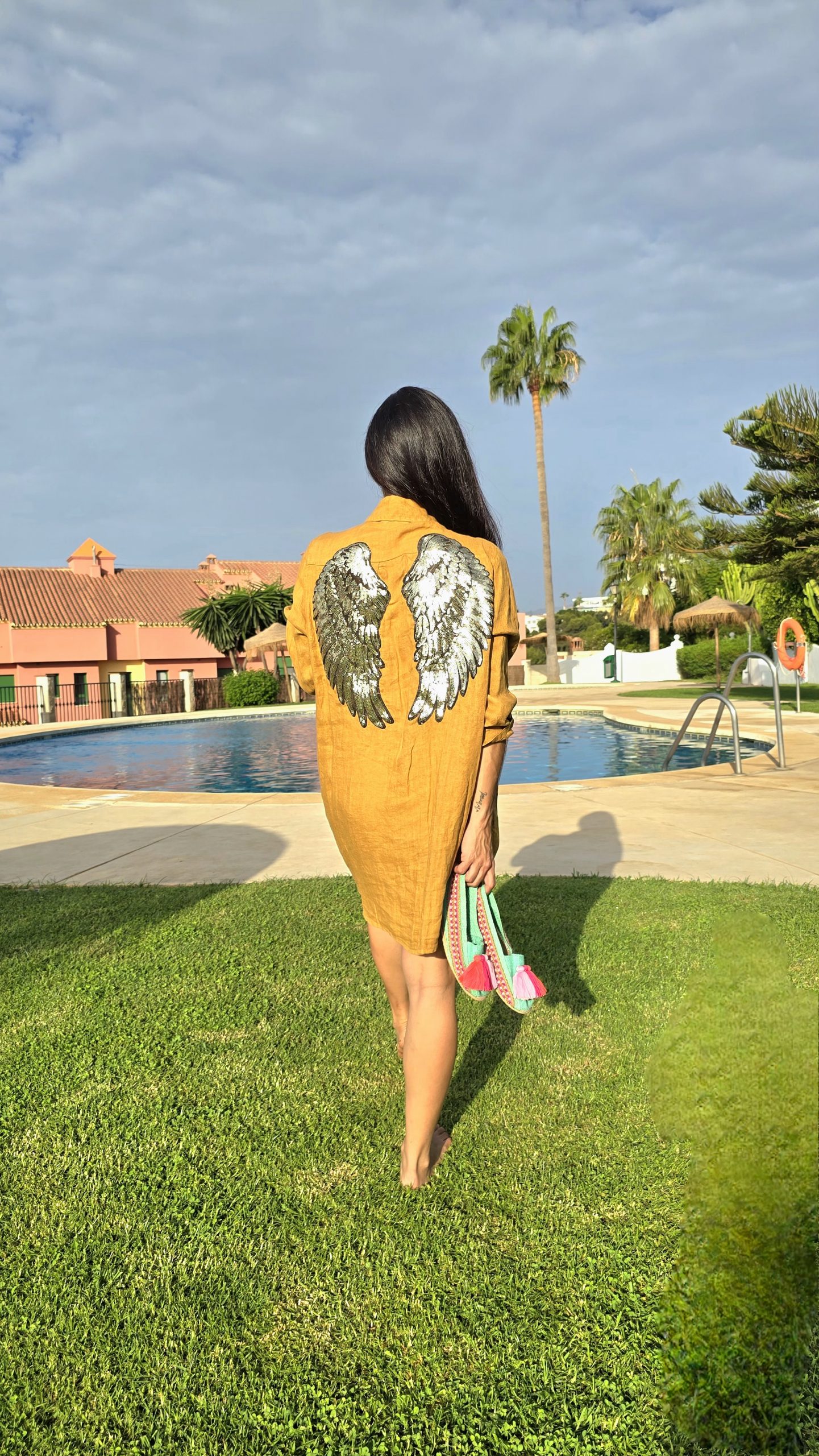 Sé el primero en valorar “Vestido de Lino miel con logo alas oro brillante”